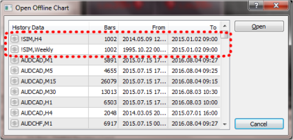 Once the Simulator is running, the extra timeframes are available as offline charts in MT4. You can open the charts using File / Open Offline, which will display a list such as the following. The extra charts created by the Simulator are listed as entries such as !SIM,H4: