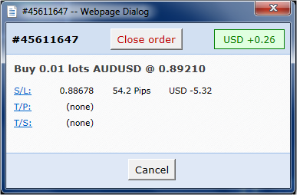 The current profit for the order shown in the top-right of the window can be switched between cash and pips by clicking on it.